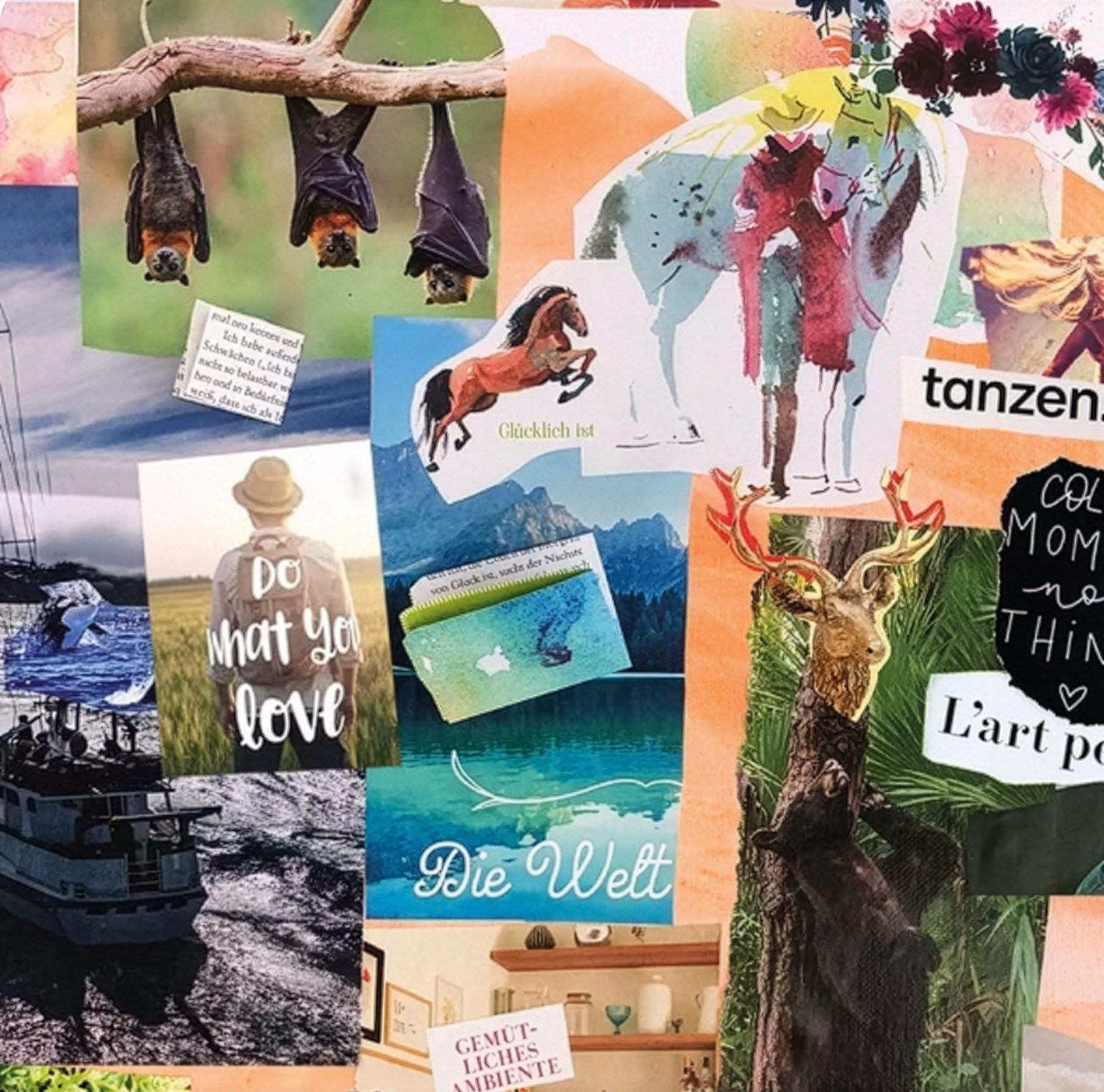 Nach einer inspirierenden Reflexionsphase tauchen wir ein in eine entspannte, achtsame Atmosphäre und du kreierst dein persönliches Visionboard als Collage aus Bildern, Textzeilen, anregenden Zitaten und vielfältigen Materialien. Dein Visionboard kann dich dann zu Hause täglich daran erinnern, was dir wirklich wichtig ist und wohin du dich ausrichten möchtest.